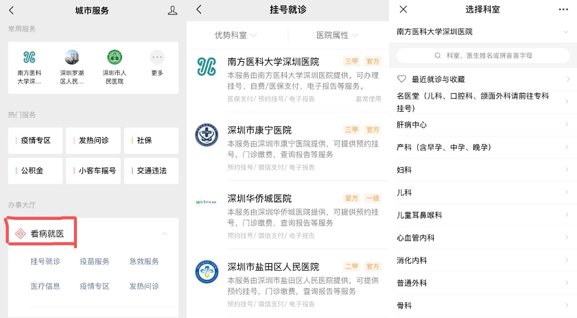 There are many popular social media applications in China Mainland. Among these apps, you must be familiar with WeChat and Alipay. They all have urban service functions which contains health-related functions such as doctor appointment and hospital department inquiry. We can choose the hospital nearby by mobile-phone positioning. Figure4 shows part of the services from WeChat and take Shenzhen city for example. These functions improve the efficiency of hospital work, simplified procedures for people to see a doctor and save time.